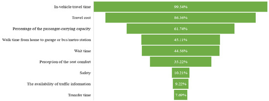 The experiment, complemented by questions associated with revealed preference (RP) and stated preference (SP), was conducted via web-based questionnaires. The RP section included the responders’ socio-demographic and mode preferences, which help explain the variations in the decision process. They established the participants’ gender, age, educational background, monthly income, household composition, car ownership, commuting travel mode, and leisure travel mode. The specific measures are shown in Table 1. All socio-demographics are categorical variables. As for the SP survey, we employed an orthogonal fractional factorial design to investigate the commuting mode choice in a cross-sectional setting. The SP survey presents three hypothetical scenarios based on short (<6 km), medium (6–12 km), and long (>12 km) distances for commuting trips. The alternatives contained public transport (bus and metro) and auto transport (taxi/ride-hailing and private car) nests. We did not provide for active modes (e.g., cycling, e-bikes, bike-sharing, ETW, and walking) as forms of access modes, since we assumed that the distance exceeded the commuters’ acceptable range when using these sustainable modes. Furthermore, inadequate infrastructure and the city’s hilly terrain are also significant barriers to cycling. Before the final questionnaires were completed, we carried out a pilot survey to investigate the timely importance of factors that travelers were concerned about and to select the attributes for our study. As shown in Figure 3, in-vehicle travel time, travel cost, and the percentage of passenger-carrying capacity show an overwhelming superiority among all considerations by the respondents, which are also decisively selected as our attributes. In addition, walk time from home to the garage or bus/metro station and the wait time also have a high share among these factors. To simplify the survey and emphasize the impact of the pandemic on motorized transportation, we integrated walk time and wait time into one variable, namely, out-of-vehicle travel time. It is noteworthy that our two-wave investigations were conducted in spring and autumn when the weather and temperature would be similar in Qingdao. Hence, the attribute of out-of-vehicle travel time disposes of the intervention of bad weather. As for the perception of seat comfort on public transport, Qingdao adopted the uniform standard for bus and metro seats. In addition, it has a lower share of all factors; hence, we do not consider this attribute in our study. Consequently, these hypothetical scenarios for commuters are characterized by in-vehicle travel time, travel cost, out-of-vehicle travel time, and the percentage of passenger-carrying capacity.