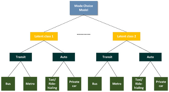 where and are the respondent ’s random utility of transit () and auto () for alternative in the segment ; and represent the systematic utility of transit () and auto (), respectively; and represent the parts that are constant for all access modes m of the nests of the transit () and auto () in the class ; and are the parts that describe the variables of alternative m that individual i chooses within the nests of the transit () and auto () in the class ; and represent the random utility of transit () and auto (), respectively. The choice transit () and auto () are considered to have segment-specific parameters of and for attribute k, and alternative-specific parameter constants and , respectively. and are the observable attributes of transit () and auto () for mode . Subscribe denotes the individual ’s socio-demographic characteristics; denotes the estimated parameter of the socio-demographic characteristic in class , while denotes the level of individual ’s socio-demographic characteristic . Figure 4 illustrates our model structure.
