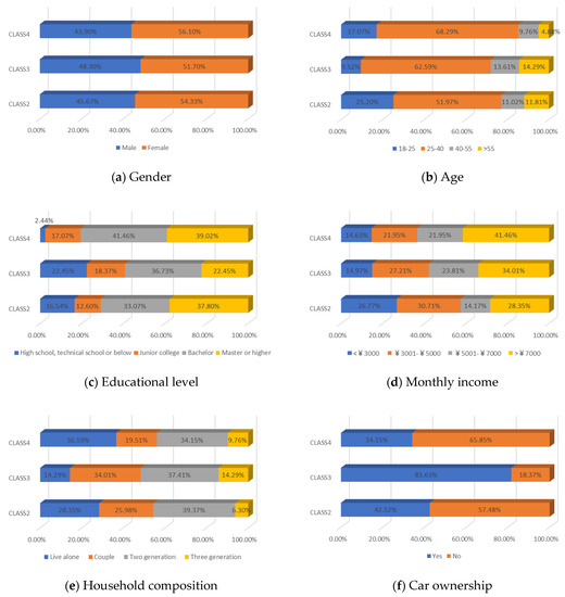 Table 4 reported the four-class LCNL model in terms of the estimation results of the class-membership model and class-specific model and model statistics (e.g., class size, convergent log-likelihood, and pseudo-R-squared). Class 1 only accounts for 4.26% of the samples, with most of the parameters statistically insignificant at the 90% confidence level. This may illustrate that the respondents in class 1 did not completely understand our choice of tasks. Therefore, we only focus on the remaining classes and analyze them in the following contexts. In our estimation results, classes 2, 3, and 4 contain 38.60%, 44.68%, and 12.46% of the respondents, respectively. The pseudo-R-squared value is 0.2878, which satisfies the requirements [50,54]. Based on the class-membership posterior probabilities from the four-class LCNL model, the proportional distribution of demographic characteristics for each class is shown in Figure 5.