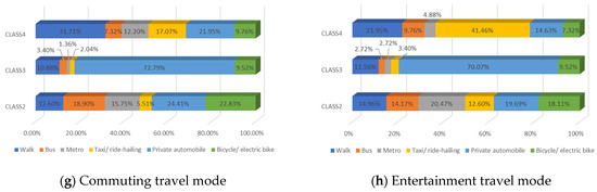 Class 2 is distinct from other classes by the values of age and income. The results provide evidence that the respondents are dominantly female (54.33%) and aged between 25 and 40 (followed by 18–25 years old). The average earnings of the respondents in class 2 are relatively low: low-income (below CNY 3000) and middle-income (CNY 3001–5000) individuals in the samples account for 26.77% and 30.71%, respectively. Meanwhile, the highest proportion of respondents received a master’s degree or higher education (37.80%), followed by a bachelor’s degree (33.07%). The majority of the respondents live with children or parents (39.37%) or are couples (25.98%). The largest percentage of respondents in this class do not have a private automobile (57.48%). As for their daily travel mode, micro-mobility, public transit, and autos account for 35.43%, 34.65%, and 29.92%, respectively, in terms of work. Micro-mobility, public transit, and auto travel occupy 33.07%, 34.64%, and 32.29% respectively, in terms of recreational activities. In the class-specific model, all the estimated parameters are significant at a 90% confidence level. The coefficient estimates for in-vehicle travel time and travel cost are negative, which is consistent with our expectations. In terms of in-vehicle travel time, the influence of public transit is higher than for an auto. Respondents would show stronger negative emotions with the increase in travel time for mass transit. However, the respondents are more sensitive to the variable of travel cost in the auto travel mode. This is understandable since individuals prefer lower fares and less in-vehicle travel time; the characteristics of mass transport are lower in cost but higher in in-vehicle travel time; conversely, the characteristics of the automobile are higher in cost but less in in-vehicle travel time. Similar trends are also shown in class 3 and class 4. As for the out-of-vehicle travel time, the respondents in class 1 represent the aversion when they wait beyond 10 min. The results of the percentage of passenger-carrying capacity (PCTR) show that the negative emotions would gather pace as the crowd increased in public transit.