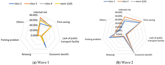 Class 2, “students or graduates from the university” in our study, has some overlap with class 4, “high-income and large-household carless individuals”, regarding the proportion of higher-educated respondents, car ownership, and public transport-oriented users. Since the average income level of class 2 is the lowest among the three classes, the aversion emotion to high travel costs for the auto and transit nest is the most intense compared with the others. Furthermore, the use frequency of public transport in class 2 is more frequent than for class 4. Therefore, the respondents in class 2 are more sensitive to in-vehicle and out-of-vehicle travel time in terms of mass transit than in class 4, whereas they reflect a lower negative perception regarding longer travel time for the auto mode. As for the percentage of passenger-carrying capacity, when the onboard environment is in a crowded condition, the members of class 2 show an optimistic attitude, while the individuals of class 4 feel pessimistic. The discrepancy of PC = 50% between class 2 and class 4 may be caused by family concerns. The individuals in class 2 are more likely to live alone and they will not pay much attention to the risk of infecting their housemates. Our questionnaires were also linked with the factors considered when the respondents made travel choice decisions, as shown in Figure 6. The loading of the factor of infection risk in class 2 also verifies the above conclusion. In a word, income level, household composition, and the frequency of use of their travel mode would significantly become potential factors that influenced travel mode choices in the first phase, during the onset of the COVID-19 pandemic.