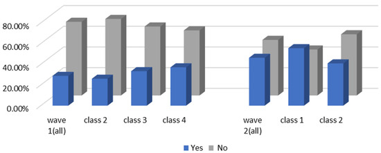In wave 1, regarding age and class, older people are more likely to be associated with class 3 and class 4, whereas younger people are more prevalent in class 2. Furthermore, the education parameters show that more highly educated individuals are presented in the population in class 2 and class 4, compared with class 3. Monthly income and the number of household members of the individuals impact the travel modes in daily life. Respondents with middle and high incomes reflect a strong association with class 3 and class 4, whereas respondents with middle- and low-earning capacity illustrate a better fit with class 2. Individuals who live in a three-generation family are more associated with class 4, and individuals who live with parents, children, or as couples are more prevalent in class 2. Individuals in class 3 are more likely to own private automobiles. According to the results of their daily mobility pattern, the members in class 3 also have strong preferences regarding driving for commuting and leisure activities. The use of public transport is more associated with class 2 than class 4. According to the significant estimated results and the characteristics of “younger, low-income, high-education, carless and mass transit-oriented”, we infer that the respondents in class 2 may be university students or graduates, and label them as “students or graduates from the university”. The characteristics of “older, normal-educated, middle- and high-income and car-dominated” in the respondents in class 3 made us name this group “car-oriented users”. Meanwhile, class 4 reflects individuals with the characteristics of high income, are highly educated, living with more family members, and show low car ownership, being labeled as “high-income and large-household carless individuals”.