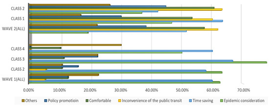 Besides their WTP, negotiation of the intention of car purchase also provides evidence to help us explore the impact of COVID-19 on travel mode choices. Figure 7 and Figure 8 report the car purchase intention and the reasons for buying a car in the two waves, respectively. In general, people worrying about the infection risk may have intensely excited a greater intention of car purchase in wave 1. Nevertheless, the income of residents experienced negative growth in the first quarter of 2020, being affected by the pandemic. Data from the Chinese National Bureau of Statistics show that the national per capita disposable income of residents in the first quarter of 2020 was CNY 8561. With the recovery of economic growth, residents’ income has also shown an improvement trend and finally ushers in positive growth in the third quarter of 2020. The data also show that in the first three quarters of 2020, the national per capita disposable income of residents was CNY 23,781, a nominal increase of 3.9% year-on-year. Combined with the reasons for car purchase in Figure 8, despite public health concerns as the most remarkable factors, poor financial background and lower disposable income levels would discourage the desire for automobile purchase. By contrast, an economic resurgence in wave 2 may become one of the outstanding prerequisites for car purchase. Furthermore, we observed that individuals in wave 2 would like to make a synthesis of their demand. Undoubtedly, time-saving needs and the inconvenience of public transport are the top two factors of all the cohort’s reasons. Still, pandemic considerations are a vital factor but have lower shares in resolving them.