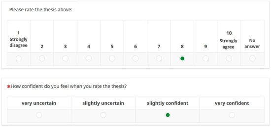 Ten-point rating scale for agreement with the thesis and four-point rating scale for indication of confidence in rating. (* = Question was mandatory if the thesis was rated with a value between 1 and 10).