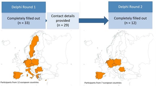 Presentation of the number of participants in the two Delphi survey rounds from the European countries involved.