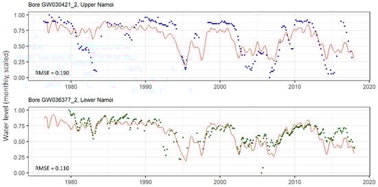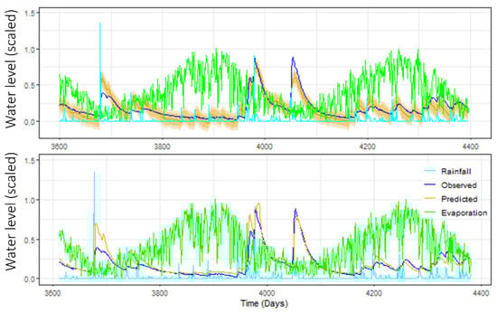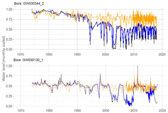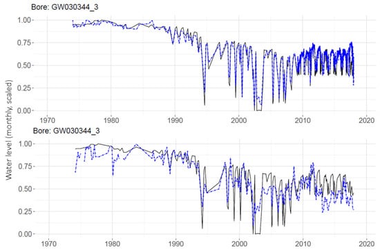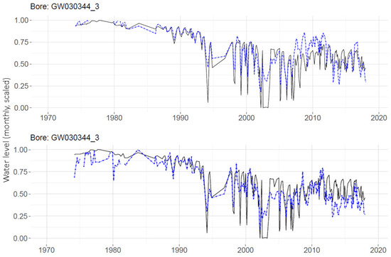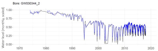 Exploratory analyses using some simple GAM models suggested that there were strong interaction effects between some of the variables and the time indicators. Such a phenomenon could well be expected, in the sense that some of the observed predictors may be effectively explaining the rate of decline or change in groundwater levels. The LSTM models are flexible enough to capture such effects. However, it is very difficult to tell whether or not the models are adequately explaining how levels change over time in a way that can be reliably projected into the future for forecasting. There are some analytical strategies that could potentially be explored to address this issue. One option is to apply some of the recently developed strategies related to explainable AI (see [37]). Another worthwhile angle would be to explore state space modelling ideas (see classic text by [38]). Such models have been developed and explored extensively in the time series literature and involve making the assumption of the existence of a latent time trend in the data, however they have limitations in terms of how predictors can be incorporated. An ideal situation may be to combine ideas of neural network modelling with state–space modelling, including the possibility that covariates can impact the rate of change of the process being modelled.