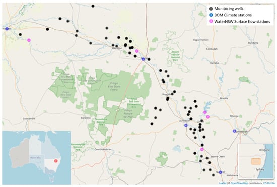 In this paper, we focus on the analysis of 165 groundwater level time series from 70 different monitoring locations across the Namoi River catchment in northern NSW, located just to the west of the Great Dividing Range. Multiple monitoring bores, or wells, are often established at the same location, in order to allow access to aquifers at different depths, hence the greater number of time series than sites. The locations of the monitoring sites and environmental monitoring locations are shown in Figure 2. The study period is 1 January 1974 to 31 December 2018.