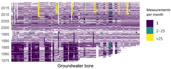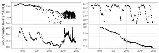 Groundwater level monitoring data have been provided by the water division of the NSW Department of Planning, Industry and Environment (DPIE). These data are also publicly available for download from a website maintained by WaterNSW [19], a state-owned corporation established under 2014 legislation to manage and oversee NSW water resources. WaterNSW owns and operates the largest surface and groundwater monitoring system in the southern hemisphere. The recorded groundwater measurements show high variability from well to well, and many of the time series contain strong temporal patterns, as can be seen in the sample of four sets of measurements shown in Figure 3. The time series are of differing lengths due to different dates of station commissioning and/or decommissioning. They are characterised by sporadic measurement frequencies and high levels of missing data. At the beginning of the records, the measurements were made manually on a 2–3-month rotation. In recent years, a few stations have had automatic telemetry equipment installed and are recording regular daily measurements. There was a total of 11 bores in this study with automatic telemeters installed. Figure 4 gives an indication of the measurement frequency at each bore and gaps in the data set.