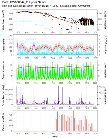 Overall, it was determined that, whilst these methods are able to do a satisfactory job of modelling groundwater levels with the use of appropriate covariates, it is nonetheless not straightforward to use them for the prediction of the future. Our analyses of the Namoi catchment data suggest that, even though data related to climate, extractions, and streamflow/dam releases can explain a relatively high proportion of the observed trends in the regional groundwater levels, it appears that some residual temporal effects remain, even after these variables have been accounted for. Model fit can be improved through the inclusion of time effects into the modelling process, and the inclusion of autoregressive terms can also help to “soak up” temporal effects. However, for the purpose of projecting further into the future, it is important to have models that can explain temporal effects through accurately measured features. Additionally, it follows that the predictions of these features into the future (e.g., future expected rainfall or future extractions) must also be accurate if they are to be relied on as predictors in the groundwater level models.