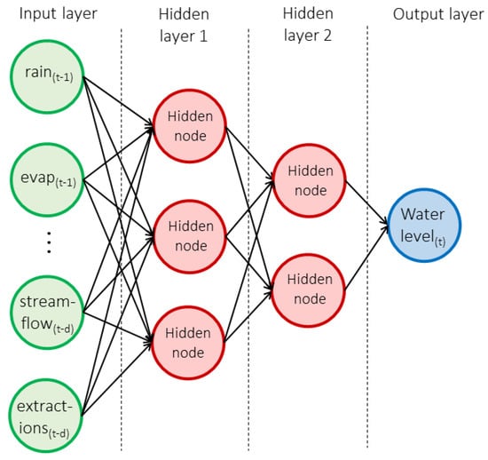 The multi-layer perceptron (MLP) is the simplest example of a supervised neural network. Like the classical statistical model, an MLP takes a set of input variables (X, also called predictors or features) and uses these to predict an outcome, Y. However, unlike the model in Equation (1) above, the MLP assumes the existence of a set of interconnected hidden layers, each of which is a function of nodes lower in the hierarchy. Data enter the network at the input layer, where each variable is represented by an input node, and then flows in one direction through the network from the input layer to the output layer. It is through the inclusion of these hidden nodes that the MLP can discover important interactions between the input variables that will be used to predict an outcome. Figure 6 illustrates an MLP with two hidden layers that predicts water level at a given time based on a set of predictors measured at past times.