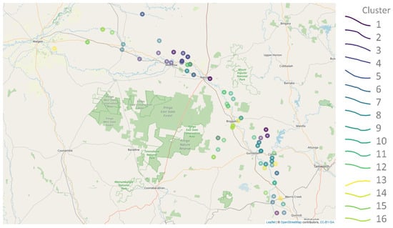 Through this process, the most common patterns among the groundwater time series are determined and visualised by the SOM. The time series are placed into groups sharing similar temporal patterns over the timeline of the study. As the SOM is unsupervised, this step focuses only on the groundwater level data and does not incorporate any information from the predictor variables—climate, surface flows, and extractions are not considered when determining the clusters. For more information on the SOM algorithm, please see [23], and for applications to water resources, please see [24].