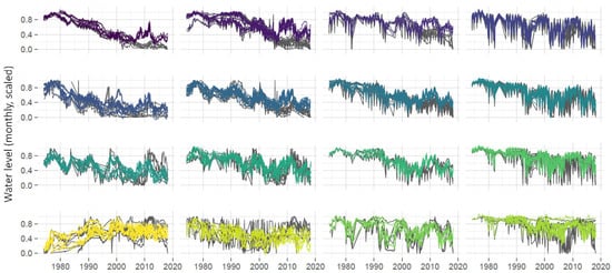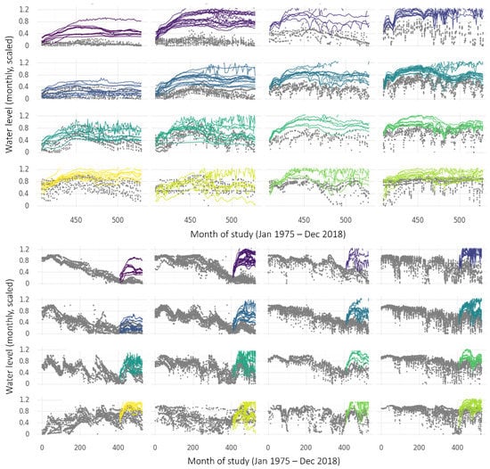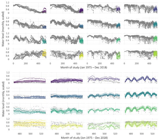 The DeepAR results, shown in Figure 16, are plotted by the SOM cluster membership of each time series (as with the global MLP, this is only for ease of visualising the multiple time series; cluster membership is not used in training the model). Actual bore measurements are plotted in grey, but predicted values are plotted using the colour key shown in Figure 11. The upper panel shows the predictions for the last five years of the study (RMSE = 0.209) coloured by the SOM cluster, overlaid on the observed data for the entire study period. The lower panel is zoomed in on the five years of prediction (i.e., the final five years of the study).