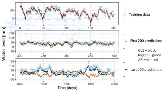 To further explore the importance of the long-term prediction of ensuring the right predictors are captured, a small computer simulation was conducted. Specifically, we generated a time series containing 2000 datapoints. The first 200 points were used for model fitting, and then the models were evaluated for how well they could predict (a) the next 200 points and (b) the final 200 points. Scenario a) could be considered an example of short-term prediction, whilst scenario b) could represent a long-term prediction. The data-generating model included a predictor that mimicked a rain variable, as well as some seasonal patterns and a long-term trend. The models that were fit included a linear regression model (ordinary least squares or OLS) that included the correct predictors, a linear model that did not include all the correct predictors, but included a lagged outcome variable, and finally, a classic time series model (ARIMA) which could exploit the autocorrelation structure in the data. Figure 18 provides the results, with the top panel showing the data used for model fitting (blue dots), along with the fitted values from the two linear models. The black line corresponding to fitted values from the linear model is virtually identical to that corresponding to the fit from the linear model with lags (green line), as well as the fit from the ARIMA model (red line). The same can be seen in the middle panel which shows the predictions for the short-term scenario (predicting the next 200 timepoints). However, the bottom panel showing the long-term prediction results shows that, while the linear model still does an excellent job, the two “time series” models (linear model with lags as well as ARIMA) both do very poorly. This is a fairly simplistic exercise based on a simple simulation, but it underscores the reality that classic time series methodologies cannot be relied on for long-term predictions. A much better strategy is to make sure that all of the right features or predictors have been identified and, where possible, used to predict the future.