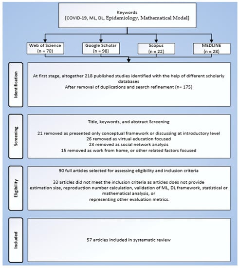 We included the number of studies using specific inclusion criteria. As this research area has recorded an enormous list of publications, therefore, the inclusion criteria are important to be defined, and are also mentioned in the PRISMA guidelines document. The inclusion criteria were applied as follows: (1) the selected studies should be published in English; (2) the article must have applied and measured any of the epidemiological factors (i.e., size of estimation, epidemic doubling time, basic reproduction number, demographic features, clinical characteristics); and (3) the implementation of a ML or DL approach to identify, analyze previous cases, and predict future rate of infection and recovery. In addition, some articles were excluded due to several reasons as follows: (1) duplicate entities; (2) title, keywords, and abstract screening; (3) non-peer reviewed articles; and (4) opinion or conceptual framework focused articles.