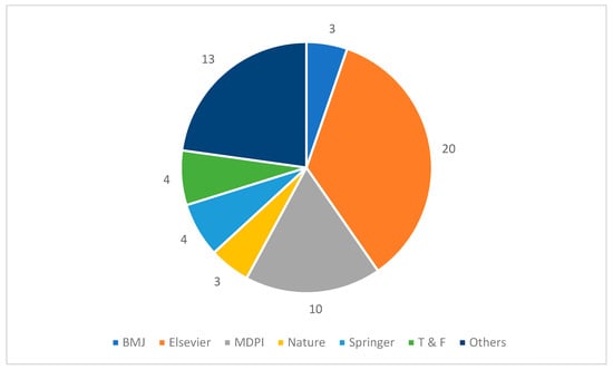 Given the large number of publications in this area of research, the selection process was not basically dependent on journal venue, rather it was based on the inclusion criteria. Therefore, the researchers’ main focus was to include articles on the bases of defined rules without considering the journal venue. However, all searching databases are well-known for academic and applied research publications. Figure 2 illustrates the selected paper’s publishing venues. Most of the selected papers were published in Elsevier (20), which is one of the prominent venues for publishing quality papers. Furthermore, 10 selected articles belong to MDPI, which is one of the largest publishing venues in academic research. In the other category, we put remaining journals such as Frontiers, Wiley, IEEE, and others.