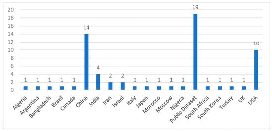 We usually selected papers that proposed, implemented, and validated the prediction model using ML, DL, mathematical, or regression techniques and applied the model to the real datasets. The population of the selected case studies belonged to 19 different countries, where the COVID-19 dataset had in particular been collected and applied for different purposes, as depicted in Figure 3. Mainly, most of the studies were associated with the population of China (22%), which has been the focal point of this disease. The researchers from that region have published a number of articles related to predicting techniques [], estimation of disease-related factors [], and impact of prevention strategies []. The number of studies selected from the United States of America (USA) and the Indian regions constituted 15% and 6%, respectively. In addition, we put some studies under the public dataset category. This category represents the used dataset that either belongs to multiple regions or has been collected from an online portal (i.e., Kaggle, GitHub, and others). A large number of countries and real-world data provided a suitable ground to review the current scenario and future aspects in this area of research.