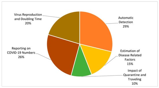 Predicting COVID-19 is handled in different ways and perspectives, from its detection to prevention there are so many areas where researchers have proposed computing solutions. The categories shown in Figure 4 portray the percentage of selected articles in different domains. “Virus Reproduction and Doubling Time” is the third largest category in this SLR and comprises 20% of the 57 articles. These articles reported epidemic doubling time and basic reproduction rate using previous data []. Overall, these estimates were useful for governmental authorities to prepare a number of guidelines for breaking the chain of COVID-19 infection.