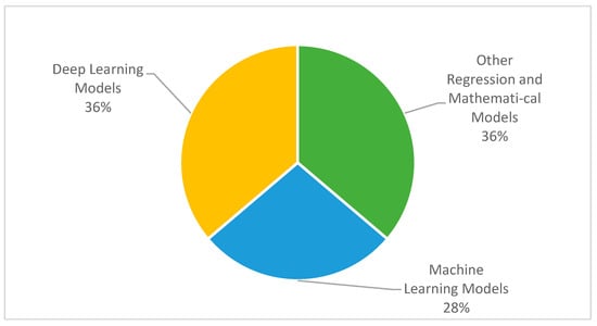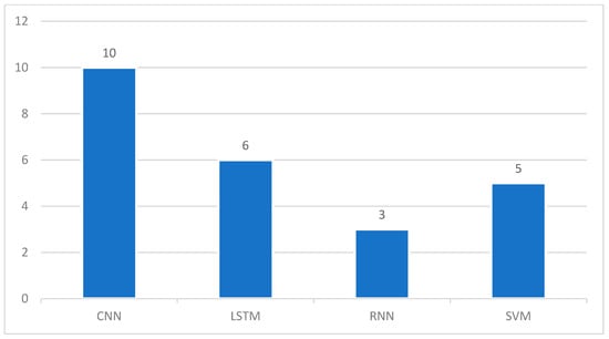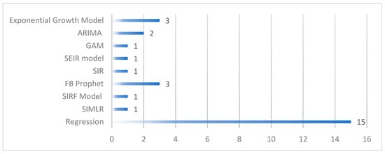 This category combines different mathematical, statistical, regression, and compartmental models that provided a number of solutions in this epidemic situation. These compartmental models use groups of populations and employ mathematical equations using different disease-related factors []. These models are also helpful for early prediction, growth rate, number of deaths, and recoveries, which ultimately can provide assistance to higher authorities in controlling the situation. Figure 8 represents the number of models covered in this category and used in selected case studies. Regression analysis (15) is at the top, which has been proved several times to apply time series analysis and forecast for future infections. In addition, the exponential growth model, the SIR Model (Susceptible, Infectious, Recovered), and its extended version such as SEIR (Susceptible, Exposed, Infectious, Recovered), SIRF (Susceptible, Infectious, Recovered, Fatalities), and SIMLR (Susceptible, Infected, Machine Learning, Recovered) are used in selected cases.