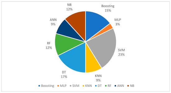 Of the selected studies, 28% of the studies implemented ML techniques to propose learning procedures or to develop prediction models. As shown in Figure 6, over 23% of the articles employed support vector machines (SVM), whereas 17% Decision Trees (DT), 15% Boosting, 12% Naïve Bayes (NB) and Random Forest (RF), 9% Artificial Neural Net (ANN) and K-Nearest Neighbor (KNN), and MLP implemented recorded the lowest %, at 3%. Previous studies highlighted the importance of the ML algorithm for multi-purpose solution building, which was further justified through measured accuracy of the models. For instance, research was applied to the multi-region datasets for (i) predicting the spread of virus in different regions; (ii) virus transmission rate; (iii) ending point; (iv) weather conditions and their association with the virus [].