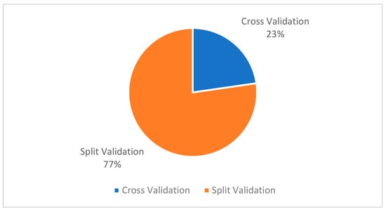 In this section, we elaborate on the number of validation strategies applied in selected case studies and their ratio, to understand the most favorable validation method in the current situation. As shown in Figure 9, most of the selected studies employed split validation (77%) strategies. One of the reasons behind split validation could be the availability of a smaller number of datasets. As per the importance and quality of cross-validation strategy discussed in previous studies [], it could be a critical point for the future researchers to: (i) encourage dataset availability on the public platforms; (ii) assess the difference between both validation strategies.