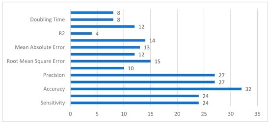 The evaluation metrics allowed researchers to quantify the work presented in any study. It also allowed the author to present the results in an efficient manner. However, the selection of the evaluation metrics is an important aspect, which is based on the type of model employed in that study. The list of quality metrics used for model evaluation in selected studies is depicted in Figure 10. The important thing to mention here, these numbers are not representing the best or worst evaluation metric, they are just presented to highlight the number of potential metrics that could be used, based on the type of forecasting model. Commonly, after reviewing all papers, we can say that growth rate, doubling time, R0, R2, MAPE, MAE, MSE, and RMSE are evaluation metrics that are useful (but not limited to) for time series, regression, compartmental models, or for other mathematical models. The remaining are possible evaluation metrics when we employed other ML or DL methods.