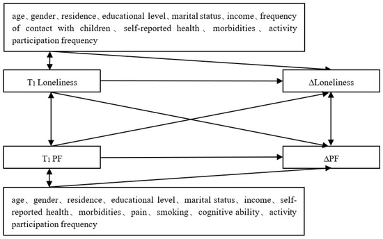 In stage II, a cross-lagged panel model (CLPM) was utilized to examine the association between changes in loneliness and PF in the total sample and different age groups. CLPM is an analytical instrument used to describe the potential reciprocal relationships or directional effects between variables over time [43]. Within the model system, we tried to focus on differences across age groups in: (a) the cross-lagged effect of baseline loneliness on the change in PF; and (b) the cross-lagged effect of baseline PF on the change in loneliness. The schematic diagram of the model is shown in Figure 1.