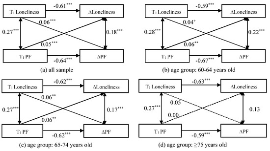In the correlation paths, there were significant positive correlations between loneliness and PF in the total sample and different age groups. This indicates that, at the same time point, older adults with high levels of loneliness tend to have more severe levels of PF. The changes in loneliness and PF were found to have a statistically significant correlation only in the age groups under 75 years old. This suggests that, at the same time point, young-old with worsening PF were likely to be accompanied by deepening levels of loneliness.
