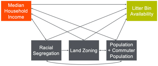 We also theorize that median household income may be indirectly associated with litter bin availability through racial segregation, land zoning, population, and commuter population. In the United States, there are well-documented racial disparities in median household income [35]. These racial economic disparities have allowed for the preservation of racial segregation [36]. In turn, the legacy and presence of racial segregation in the US has limited the amount of recourses for certain communities, thus influencing a community’s median household income [36]. As such, we present bidirectional associations (represented by the double-headed arrows) between median household income and racial segregation in Figure 1 [37,38]. Additionally, in the United States, land zoning has either inadvertently or overtly been used to promote economic segregation [39,40]. Therefore, in our theoretical framework, we present bidirectional relationships between median household income and land zoning. Since the 1960s, there have been claims that the misuse of land zoning has contributed to the prevention of equitable access to urban infrastructure and has created clusters of poverty within NYC [41,42]. Thus, it is reasonable to infer that land zoning is associated litter bin availability. There are well documented associations between median household income and population density [39]. We also expect that increases in population density are associated with increases in litter bin availability.
