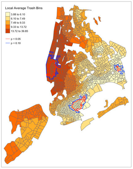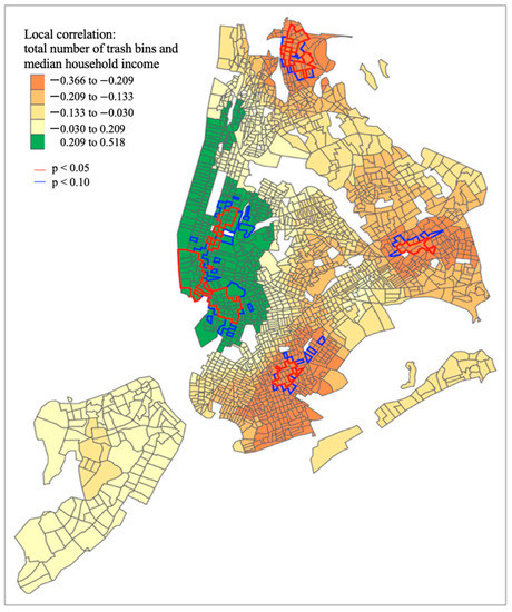 Figure 2 depicts the spatial dependence of litter bin count by census tract in NYC. Census tracts with significant spatial autocorrelation at an alpha of 0.05 are outlined in red and census tracts with significant spatial autocorrelation at an alpha of 0.10 are outlined in blue. Figure 3 depicts the correlation between the count of litter bins in a census tract and median household income. There are significant correlations between median household income and litter bin availability in census tracts located in Manhattan, Brooklyn, Queens, and the Bronx, outlined in red at an alpha of 0.05 and outlined in blue at an alpha of 0.10.