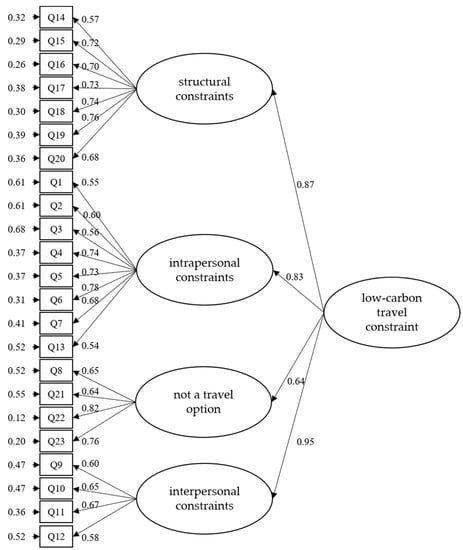 Tan [39] explained that research on leisure barriers and travel constraints has often been based on a model of intrapersonal constraint, interpersonal constraint, and structural constraint. Crawford et al. [37] asserted that an individual’s intrapersonal constraints are related to their mental state, including personality traits, attitudes, beliefs, and emotions. Interpersonal constraints are determined by interactions with friends, family, colleagues, neighbors, and others. Structural constraints prevent people from acting, including economic resources, available time, and accessibility. Therefore, the low-carbon travel constraint base is also in line with Crawford et al.’s [37] model. Given the complex nature of travel constraints, researchers often use the three-dimensional leisure constraint framework to explore the obstacles of tourists in different travel situations. These include essential natural tourism [40] and cruise tourism [14]. Adopting factor analysis, many travel scholars have confirmed this three-dimensional leisure constraint framework to be effective and reliable [41].