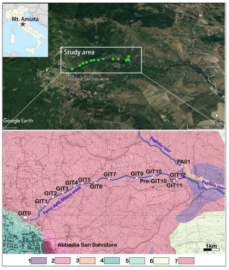 Location of the Mt. Amiata area and the Fosso della Chiusa creek (above) along with the schematic geological map (below) (modified from the Geological Database of Regione Toscana: http://www502.regione.toscana.it/geoscopio/geologia.html#, accessed on 4 June 2021, in which the IDs of the sampling sites are reported. 1, landslide; 2, detritus; 3, recent and present alluvial deposits (Holocene); 4, eluvial and colluvial deposits (Holocene); 5, rhyo-dacitic volcanics (Pleistocene); 6, (basal olistostrome) dark-greyish clays with blocks of marly limestone, calcareous microbreccia, and sandstone (Upper Oligocene); 7, Ligurian domain: clays and marls with limestone, marly limestones, sandstone, and calcarenite, occasionally intercalated with sedimentary breccia consisting of green rocks, jaspers, and limestones (Paleocene-Lower Cretaceous).