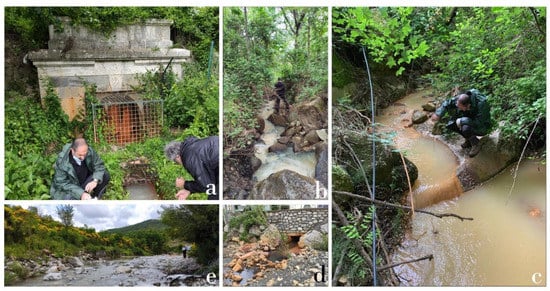 (a) Waters discharging from Galleria Italia (GIT0) feeding the Fosso della Chiusa creek. Note the whitish-reddish waters at the GIT0, GIT3 (b), a couple of hundreds meter from the emergence, and GIT6 (c), about 1 km from the emergence, sampling sites; (d) FdC waters entering the Pagliola creek after supplying the “La Turbina” hydroelectric plant; (e) the Pagliola creek after the confluence with FdC.