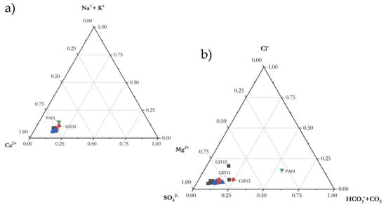 Cationic (a) and anionic (b) triangular diagrams of the studied waters (FdC sampling: 4 June 2020 black square; 12 June 2020 blue triangle; 23 June 2020. Pagliola creek: green triangle).