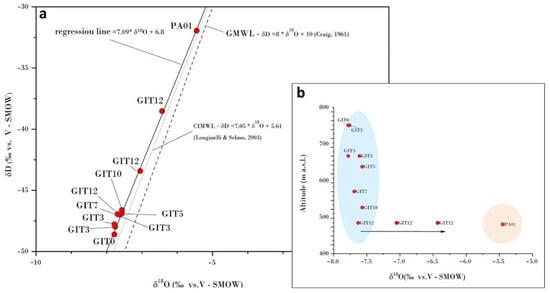 It is noteworthy to point out that water isotopes tend to become heavier as they travel from the emergence (at about 790 m) to the confluence with the Pagliola River (at about 480 m), the latter being characterized by more positive δD and δ18O values. Setting aside the water isotopes of GIT12, sampled during the three sampling campaigns, which tend to progressively approach that of PA01, the distribution of FdC waters indicates that no significant evaporation processes affect the water samples (Figure 4), likely as a result of the torrential character of the creek. Altitude plays the most important role, as supported by the altitude (in m) vs. δ18O binary diagram (Figure 4b), which shows that, at a relatively steep decrease in terms of elevation, oxygen isotopic values are concentrated in a narrow, decreasing range. The isotopically heavier samples are those originating before the confluence with the Pagliola River, where the FdC slope is lower than the upper reaches of the creek. Assuming an isotopic gradient of −0.2‰/100 m, which characterizes the rain waters from the western part of Italy, e.g., [], the waters discharging from Galleria Italia (GIT0) enter the shallow underground circuit at an elevation of about 1100 m.
