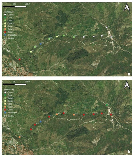 Sampling sites and Igeo classes [] along FdC: (a) Arsenic and (b) Mercury. The easternmost portion of Abbadia San Salvatore and the location of PA01, corresponding to the Pagliola creek before the confluence of the FdC creek, are visible in the lower left and upper right corners, respectively. The two maps were created with QGIS using Bing Satellite as the base-layer. Legend (according to [,]): Class 0 = “uncontaminated”; Class 1 = “from uncontaminated to moderately contaminated”; Class 2 = “moderately contaminated”; Class 3 = “from moderately contaminated to heavily contaminated”; Class 4 = “heavily contaminated”; Class 5 = “from heavily to extremely contaminated”; Class 6 = “Extremely contaminated”. Sample GIT3 was reported in blue, since no data were available.