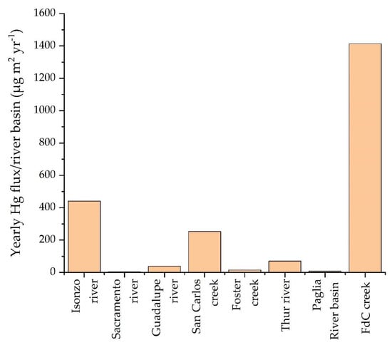 By comparing the yearly mass load of Hg from the FdC creek with other mining-affected areas, such as the Isonzo River (ca. 1500 kg year−1, []), which drains the entire Idrija area, and the Guadalupe River, which drains New Almadén, California [], it is possible to state that the amount of Hg discharged by FdC is relatively low (Table 5). However, if we consider the specific yearly Hg mass load, i.e., the total mass load divided by the drainage basin (see []; Table 5), the FdC creek can be regarded as a significant source of Hg (Table 5, Figure 6). Basically, the FdC yearly mass load of Hg is comparable with those of the Bonanza mine in western Oregon (Table 5, 0.75 kg year−1; []) and the San Carlos creek, which drains the New Idrija Hg mine, California (1.5 kg year−1; []).
