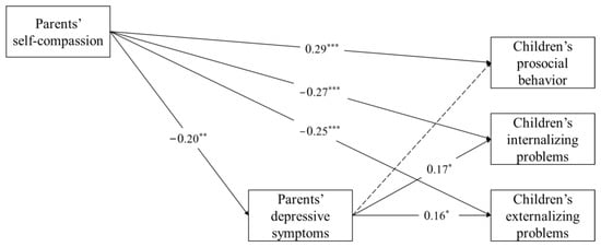 Final model of depressive symptoms as a mediator between parents’ self-compassion and child adjustment. χ2(2) = 1.33, p > 0.05, CFI = 1.00, TLI = 1.06, RMSEA = 0.00, SRMR = 0.01. Covariates including monthly family income and child and parent gender were included as control variables but are not depicted in the figure for clarity. Non-significant paths are shown in dashed arrows. * p < 0.05, ** p < 0.01, *** p < 0.001.