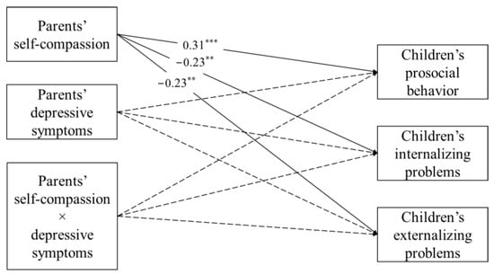 As little has been done thus far to understand the role of parental self-compassion in the family context, it is important to clarify its role in relation to parental depression and child adjustment. Hence, as a competing hypothesis, self-compassion was tested as a moderator between parental depressive symptoms and child adjustment, over and above established covariates of parental depression and child adjustment, including child gender [,,], parent gender [], and family income [,]. Notably, parents’ ability to be compassionate toward themselves amidst the presence of depression might attenuate the negative effect of depressive symptoms on child adjustment. Supporting this hypothesis, previous research showed that caregivers’ positive behavior, such as high quality child care, buffered against the negative effect of parental depression on child adjustment []. In another study, mother–child attachment security moderated between maternal depressive symptoms and children’s prosocial behavior in early childhood []. Based on these findings, parents’ self-compassion might buffer the association between parental depressive symptoms and child adjustment. That is, as an attribute, parents’ self-compassion might reduce the negative effect of parental depression on child adjustment.