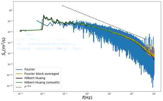 The turbulence energy spectrum represents the amount of turbulent kinetic energy (TKE) associated with eddies of different scales. In this study, the spectral analysis was performed using the Hilbert–Huang transform method, proposed by Huang and coworkers [33]. The Hilbert–Huang transform method is an adaptive spectral analysis based on the local characteristics of the signal, and is therefore sensitive to transients and non-linearities.