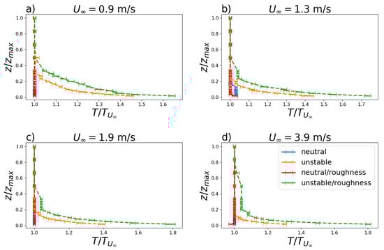 Figure 4. Vertical temperature profile for U = 0.9 , 1.3 , 1.9 and 3.9 m s 1 (ad) for neutral and convective stability (unstable) with (roughness) and without surface roughness. Horizontal lines represent the standard deviations.