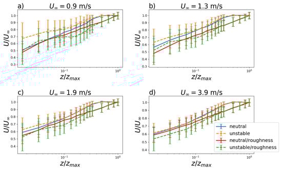 Figure 5. Vertical profile of the longitudinal mean velocity U for U = 0.9 , 1.3 , 1.9 and 3.9 m s 1 (ad) for neutral and convective stability with and without surface roughness. Vertical lines represent the turbulent velocity standard deviations.