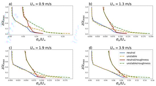 Figure 6. Vertical profile of turbulence intensity σ u / U for U = 0.9 , 1.3 , 1.9 , 3.9 m s 1 (ad) for neutral and convective stability with and without surface roughness.