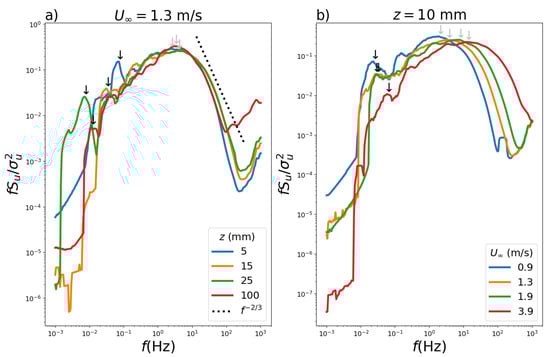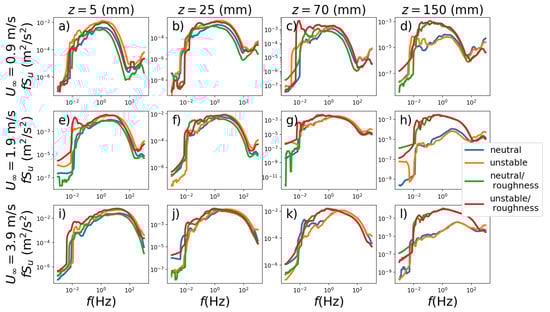 The normalized spectra obtained when the height was chosen as z = 10 mm and the free flow velocity influence is shown in Figure 8b for U = 0.9 , 1.3 , 1.9 and 3.9 m s 1 . By increasing the velocity, the intensity of the spectral maxima associated with low frequencies and convective turbulence decreases. Nonetheless, with increasing free flow velocity, the spectral maxima associated with mechanical turbulence in the range of higher frequencies shifted towards higher values. Figure 9 shows the corresponding plots for Figure 8 but with surface roughness, where similar analyses can be made.