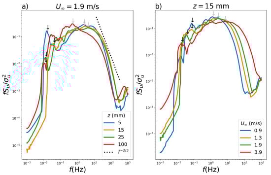 The normalized spectra are presented for a convective regime with a smooth wind tunnel floor (Figure 8). The normalized spectra for velocity U = 1.3 m s 1 are compared for the four heights z = 5 , 15 , 25 , 100 mm (Figure 8a). There are two spectral maxima for all heights, with the dominant maximum located at higher frequencies, which is due to eddies of mechanical origin, and a secondary maximum located at lower frequencies due to eddies originating from convection. These properties of the two maxima are also identified in observational data of the convective planetary boundary layer [39,40].