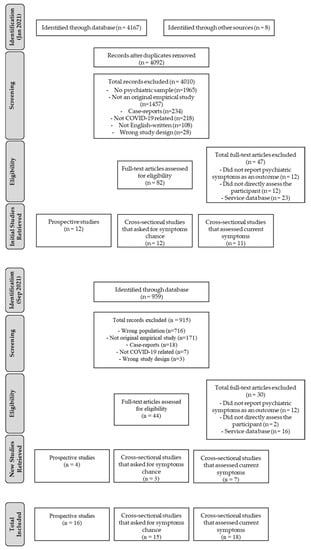 The inclusion criteria were: (a) study design: prospective and cross-sectional studies; (b) population of interest: adult people with psychiatric disorders diagnosed prior to the COVID-19 pandemic; (c) measure of psychiatric symptoms: studies were included if quantitative measures of psychiatric symptoms were measured before and during the COVID-19 pandemic, with both self-reported or observed measures (e.g., telephone/online surveys with in–outpatients from psychiatric services, etc.) performed by a mental health professional; and (d) language: English-language studies. Importantly, genetic syndromes and neuropsychiatric conditions (such as dementia and cognitive impairments) were not considered as psychiatric samples.