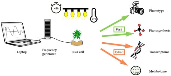 Schematic representation of the experimental setup used for electromagnetic field irradiation and analysis of plant material. The plants were grown and treated at 21 °C and 10/14 h day/night conditions. The settings for the electromagnetic irradiation were transferred to the Tesla coil via the frequency generator. The treated plants were placed on the emitter and irradiated for 48 h. The untreated plants were placed outside of the irradiated area. The intact plants were phenotypically and photosynthetically analyzed, while the transcriptome and metabolome analysis were carried out with plant extract.