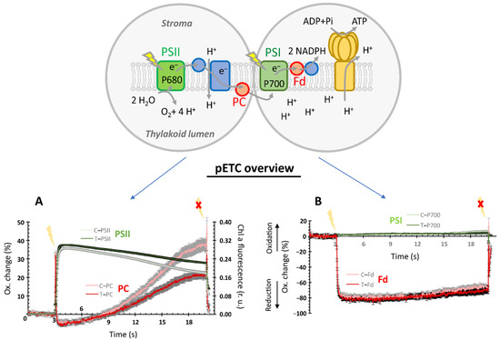 Effect of electromagnetic field irradiation on light-induced redox kinetics in A. thaliana photosynthetic electron transport (PET). Dark-adapted leaves of 30-day-old A. thaliana (Col-0) plants, which had previously been exposed to EMF irradiation for 48 h (treatment = T, control = C) were analyzed for the light-induced kinetic redox changes in PSI (photosystem I), PC (plastocyanin), and Fd (ferredoxin). Simultaneously, the chlorophyll a fluorescence was recorded to also quantify the efficiency of PSII (photosystem II). The pictogram in the figure highlights these components and their relative position in the PET. For this analysis using Dual-KLAS-NIR (Walz, Germany), leaves were exposed to light (160 µmol photons m−2 s−1) for 17 s with simultaneous recording of the electron flow through PET. This light period was flanked by recording for 3 s in the dark before and ~300 ms afterward as presented in A and B. As indicated in the figure, (A) gives the major treatment-specific effects on the Chl a fluorescence and redox kinetics of PC components on the acceptor side of PSI, while (B) shows minor changes observed for PSI and Fd redox shifts. The given redox changes for individual components are based on deconvolution using the model spectra generated from similarly grown plants followed by scaling using the estimated pool sizes for each component.