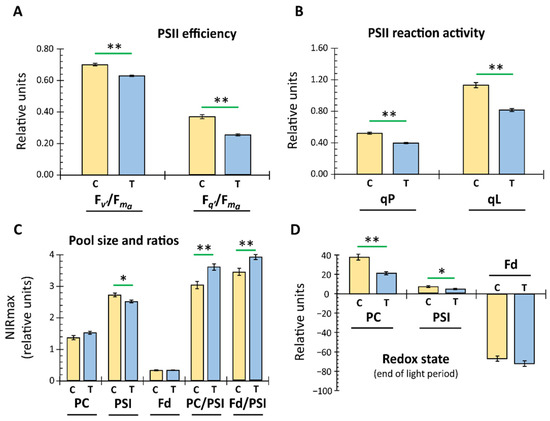Effect of 48 h electromagnetic field irradiation on photosynthetic parameters in A. thaliana. The control (C) and treatment (T) groups were handled as described (2.2). The recorded data, as given in Figure 2, were further evaluated for identifying specific irradiation effects among differently derived photosynthetic parameters and their statistical significance. Parameters such as maximum PSII efficiency in light (Fv’/Fma; A), operating PSII efficiency in light (Fq’/Fma) (A), coefficient of photochemical fluorescence quenching (qP; B), and estimated fraction of open PSII reaction centers (qL; B) were calculated (means ± SE, n = 34–37, p < 0.01 **, Student’s t-test). Derivation of these parameters is based on the recorded initial chlorophyll a fluorescence maxima in dark-adapted leaves on exposure to actinic light (160 µmol photons m−2 s−1). Dual-KLAS-NIR (Walz, Germany) also enables automated estimation of pool sizes and their respective ratios for PC, PSI, and Fd, given as maximum absorption in the near-infrared NIRmax (C) (means ± SE, n = 34–37, p < 0.05 *, and < 0.01 **, Student’s t-test). (D) The recorded redox state for PC, PSI, and Fd at the end of the light period was compared between control and treated plants, and the significant differences are indicated (means ± SE, n = 34–37, p < 0.05 *, and < 0.01 **, Student’s t-test).