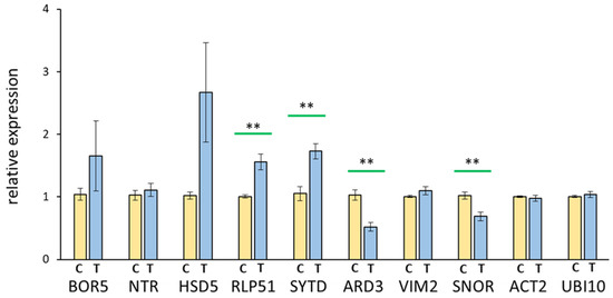 Quantitative qRT-PCR. Representation of the relative transcript amounts of the targets BOR5, NTR, HSD5, RLP51, SYTD, ARD3, VIM2, and SNOR (see text for details) from the treatment (T) and control (C) cDNA. The values were normalized on the control and the housekeeping transcripts Actin and Ubiquitin [37]. Relative transcript amount to control and reference genes actin and ubiquitin. Data were obtained in four independent experiments with replication, n = 8, means ± SE, Student’s t-test, and p < 0.01 **, indicated by green bars.