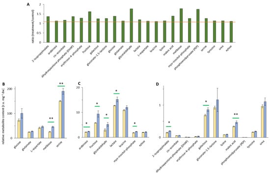 Metabolomic changes in Arabidopsis thaliana leaves represented as ratio of treatment/control >1.1. Metabolite levels of treatment and control extracts were measured using GC–MS in leaves from 30-day-old plants after 48 h of EMF irradiation. Control samples are given in yellow, and the treated samples are in blue. (A) Overview of increased ratio of the relative metabolite content between treated and control extract metabolites (>1.1, orange bar). (B) Upregulated high relative metabolite content [r.u. mg−1 dry weight]. (C) Upregulated intermediate relative metabolite content [r.u. mg−1 dry weight]. (D) Upregulated low relative metabolite content [r.u. mg−1 dry weight]. Independent experiments = 3, n = 6, means ± SE, Student’s t-test, p < 0.01 **, and p < 0.05 *, indicated by green bars.